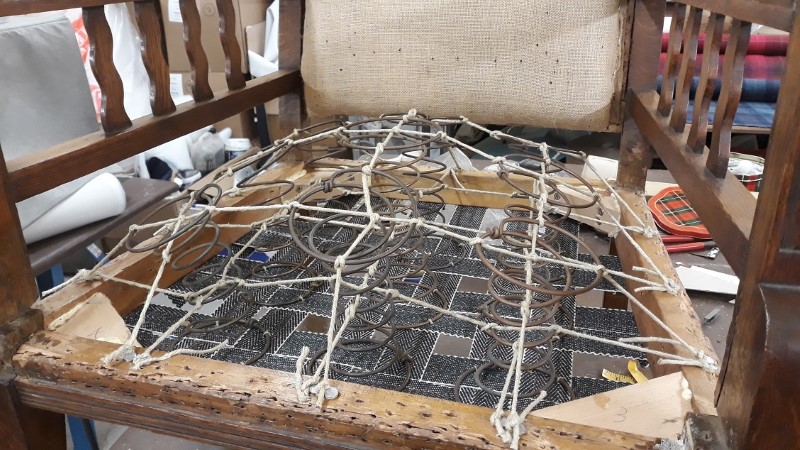 Firstly, we wanted to give you an insight into what’s beneath the surface of a durable piece of furniture. Note “durable” – because all chairs are not created equal! However glamorous the fabric covering, glory fades quickly if the build-up underneath is inferior. Time and use will always wear away at your furniture – but built well initially/re-upholstered properly, it will last a century; poorly or cheaply built, it will be uncomfortable within a few years. Here are some images to show what goes on behind the scenes. This shows the recent re-upholstery of an antique, but whether we build furniture from scratch on raw wooden frames, or re-build and restore the glory of fading antiques, we ensure the build-up is sufficient to last for years.